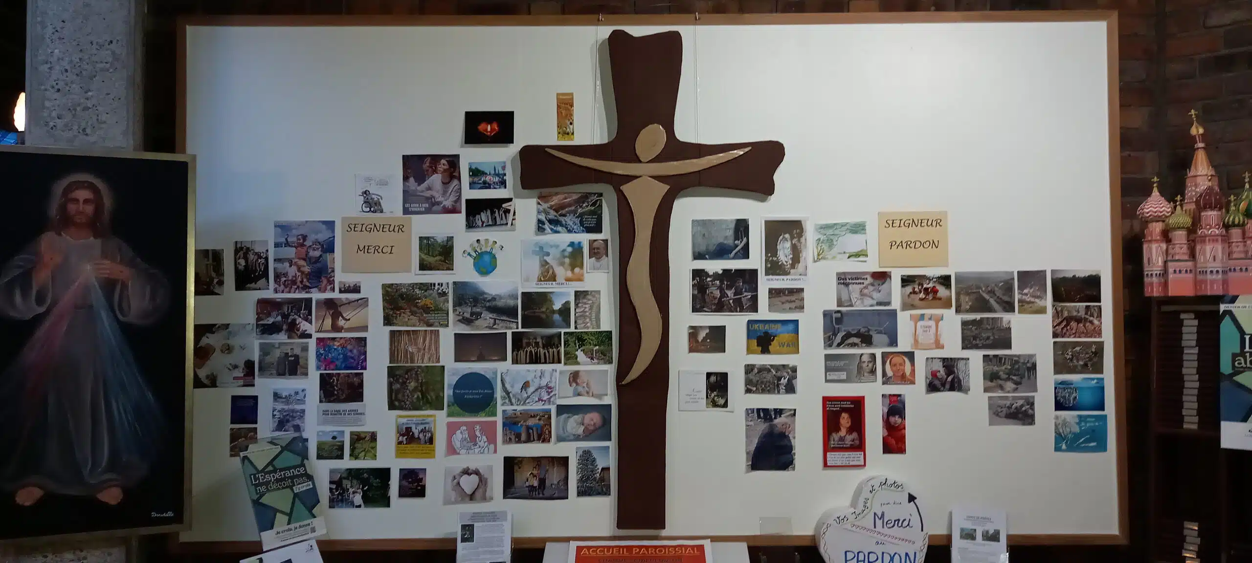 - Carême : invitation aux paroissiens à déposer sur un panneau à l’entrée de l’église des images/photos exprimant d’un côté de qui a été détruit dans la Création, les violences humaines et les dégâts environnementaux pour demander Pardon au Seigneur, et de l’autre, ce qui a été beau et bon, pour dire Merci au Seigneur