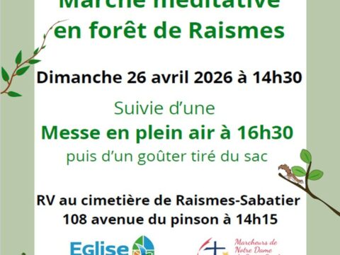 26 avril 2026 @ 14 h 15 min – 18 h 00 min – Marche méditative en forêt de Raismes Dimanche 26 avril 2026 à 14h30 suivie d’une messe en plein air à 16h30 puis d’un goûter tiré du sac. RV au cimetière de Raismes-Sabatier 108 avenue du pinson à 14h15 (en partenariat avec Les Marcheurs de Notre-Dame)