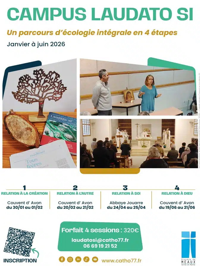Maurice DRAPIER / Béatrice de MONTLEAU Béatrice: 06 10 67 54 83L’équipe d’écologie intégrale du diocèse de Meaux vous propose le Campus Laudato Si’ 77, un parcours-découverte en quatre sessions qui se dérouleront au cours du 1er semestre 2026.
