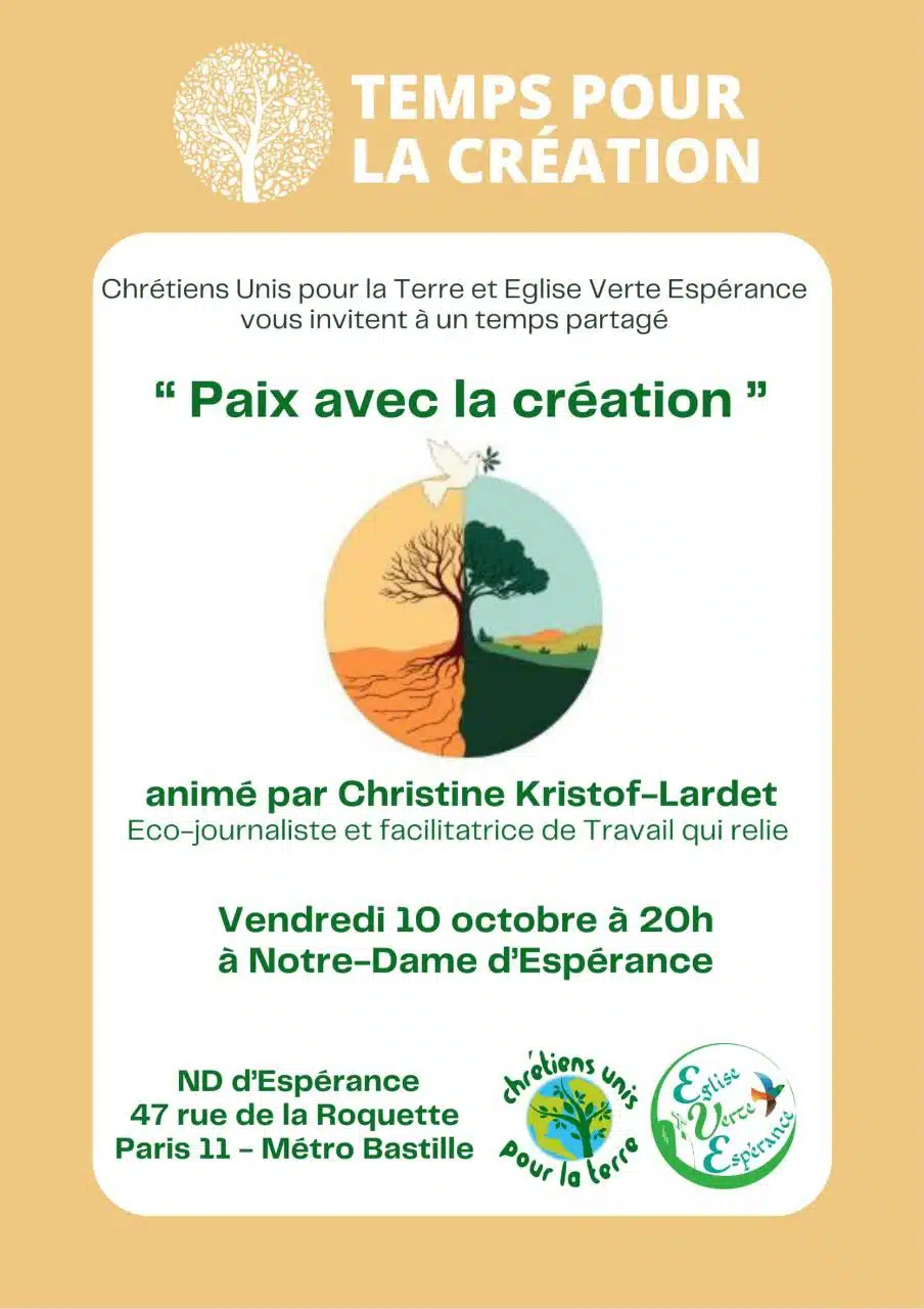 Chrétiens Unis pour la Terre et Eglise Verte Espérance contact@chretiensunispourlaterre.orgChrétiens Unis pour la Terre (CUT) et Église Verte Espérance (EVE) vous invitent à venir vivre un temps spirituel et d’expérience sensible autour du thème “PAIX AVEC LA CRÉATION”, à l’église Notre-Dame d’Espérance (47 rue de la Roquette – 75011 Paris).