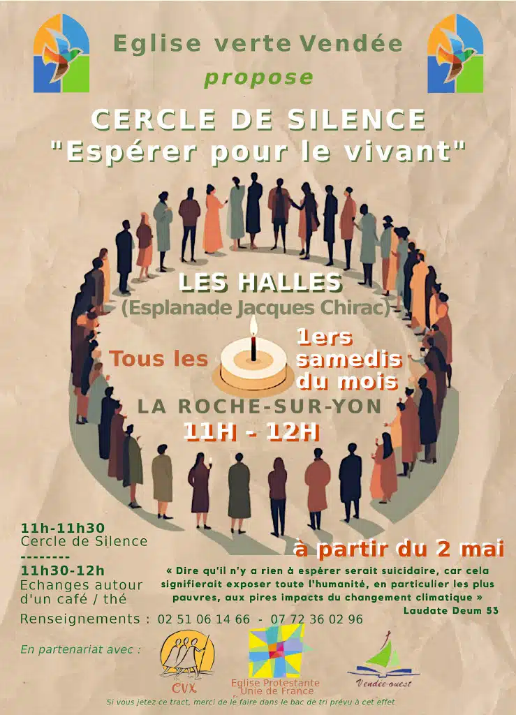 Église verte Vendée en œcuménisme, avec CVX, EPUdF Eglise réformée la Roche sur Yon vous invite à participer au cercle de silence tous les 1ers samedi du mois, de 11h à 12 h, place des Halles à la Roche sur Yon. La thématique générale qui éclairera les cercles est « sensibiliser le public aux problèmes environnementaux et à leurs impacts sur les populations et la biodiversité ». Merci de votre participation .