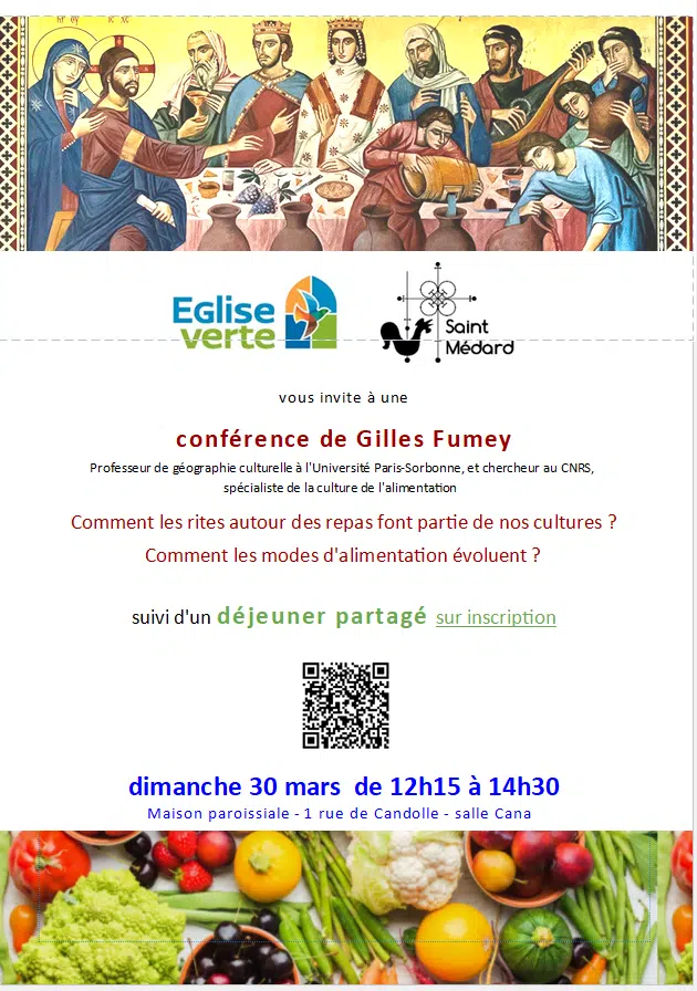 GROUPE EGLISE VERTE SAINT MEDARD cecile.plassat@gmail.comLe groupe Église verte de la paroisse St Médard vous invite à une conférence de Gilles Fumey, professeur de géographie culturelle à l’Université Paris-Sorbonne, et chercheur au CNRS, spécialiste de la culture de l’alimentation, créateur des cafés géo.