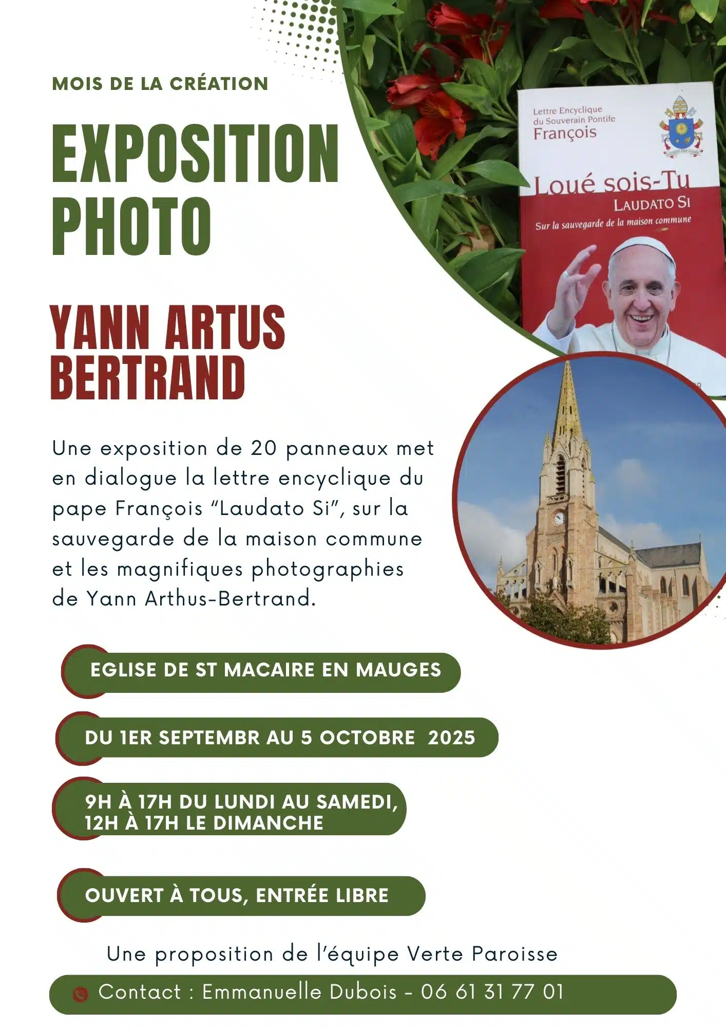 Une exposition de 20 panneaux met en dialogue la lettre encyclique du pape François « Laudato Si » sur la sauvegarde de la maison commune et les magnifiques photographies de Yann Arthus-Bertrand à l’église de St Macaire en Mauges. L’église est ouverte de 9h à 17h tous les jours. Une belle idée de sortie en famille ou entre amis.